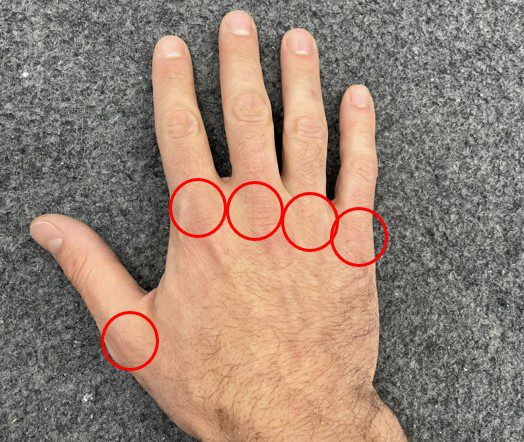 Image 1. Photo identifying Metacarpophalangeal (MCP) joints of the fingers and thumb.