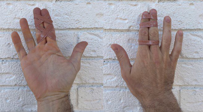 When climbing, buddy taping should be used until the ligament has fully healed. I recommend using the “double X” method shown below, as it tends to stay in place better than other methods. However, when not climbing, two simple loops of tape above and below the middle knuckle will get the job done. I prefer to use Leukotape because it’s stiff and sticky, but any climbing tape should work. Reusable buddy tape finger straps can also be purchased online for daily wear, but tape is still recommended while climbing.