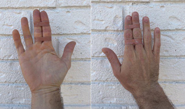 After the splint is removed, buddy taping should be used at all times up to the 6 week mark, including while sleeping. When possible, the injured finger should be taped to the adjacent finger on the side of the injury. However, this isn’t always possible for the index or pinky finger, which can just be taped to the middle or ring finger, respectively.