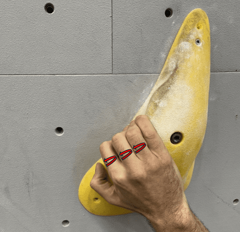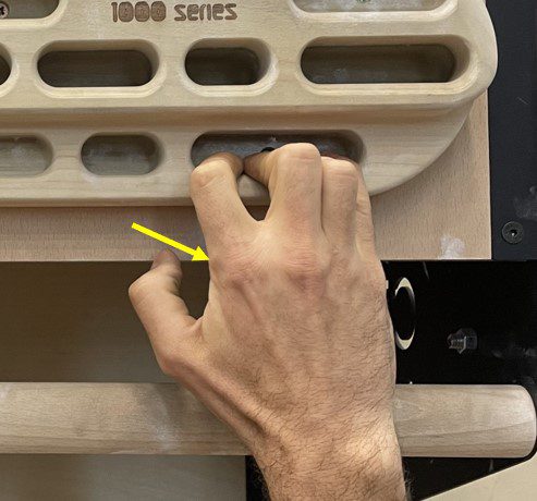 Image 7. Half crimp position with improper finger alignment. Added stress on collateral ligament on thumb side of pointer finger (arrow).