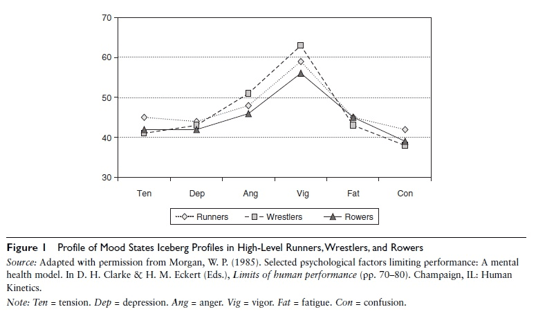 Figure 1: Profile of Mood States Iceberg Profiles in High-Level Runners, Wrestlers, and Rowers. ( Copied from https://psychology.iresearchnet.com/sports-psychology/sports-and-personality/iceberg-profile/#google_vignette)
