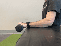 With your elbow slightly bent supported on a table, hold a five pound dumbbell in your hand. Only your wrist and hand should be hanging off the table. With your palm facing down, pull your wrist up towards you and then slowly lower the weight (top photos). Then, turn your hand so that your palm is facing up and bring the dumbbell up toward you, then slowly lower (bottom photos). Perform two sets of five in each direction per hand.