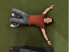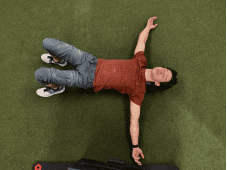 Lie vertically on a foam roller so that your head is in contact with one end and your tailbone with the other. Keeping your back flat on the foam roller, bring your arms out to the side at about a 90 degree angle to your body (photo 1). If your back arches here, decrease the angle of your arms. Breathe through the position for about 20 seconds, then see if you can increase the angle of your arms (photo 2). Repeat through five to six positions, or for about three minutes.